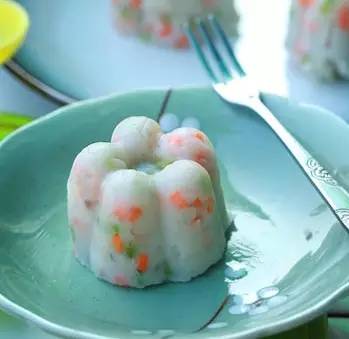 5、準(zhǔn)備好果凍模,在內(nèi)壁涂上一層香油,然后填入混合山藥泥,用勺子壓緊,再倒扣在盤中,即可開吃拉。
