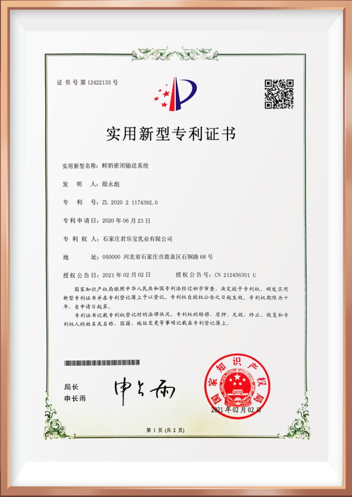 旗幟奶粉“鮮奶密閉輸送系統(tǒng)” 國(guó)家專(zhuān)利技術(shù)證書(shū)