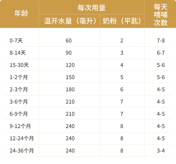 嬰幼兒每天的喂哺量和次數可以參考《喂哺表》,還應根據寶寶實際需求進行調整;奶粉沖調應按照一定比例,不宜過濃或過淡。