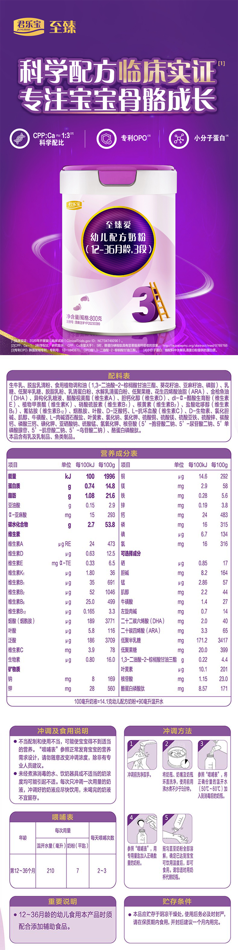 至臻愛幼兒配方奶粉,CPP:Ca≈1:3,含有專利OPO和小分子蛋白,科學(xué)配方臨床實(shí)證,專注寶寶骨骼成長(zhǎng)。